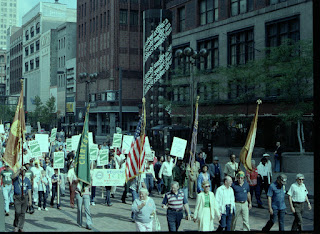 As I am going about my daily business in metro Detroit yesterday, I ran across a video from the Detroit Historical Society about the Floral Telegraph Delivery, better known as FTD, and their 1960 convention in what was called Cobo Hall (now Huntington Place). Watching the video made me recall memories of the old J.L. Hudson Department store, which was one of the tallest department stores in the city of Detroit, if not the country, and was as well known in Detroit as Marshall Field was in Chicago and as Macy's was in New York City. The Greater Hudson's complex was bounded by Farmer, Gratiot, Woodward and Grand River in downtown Detroit. Generations of Detroiters shopped here for various products (they delivered to your house if a product you purchased was large) and was especially grand around the Christmas holidays. Many metro Detroit brides consulted Hudson's on all aspects of their special day, from their trousseau to furnishing their marital home, and one memorable promotion was the "Good Ol' Summertime," which had a setup that hearkened back to the late 1890s-early 1900s. A large flag was draped on the Woodward side of the building on June 14, Flag Day. it was retired in 1976 to the Smithsonian Institute, and has been respectfully destroyed as of 2023. Business dropped off in the 1970s and early 1980s, and the store closed in 1983. Hudson's was demolished in October 1998, and currently, a mixed use building is being constructed on the site. I think of some pictures I discovered in my late father's collection, taken at Detroit's Labor Day Parade in 1981, where the parade passed by Hudson's on its way to Kennedy Square for the rally. One picture is shown below.